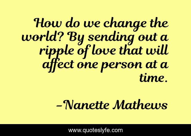 This page presents the quote "How do we change the world? By sending out a ripple of love that will affect one person at a time.". Author of this quote is Nanette Mathews. This quote is about caring, change-world, ripple-of-love, compassion, inspirational, enthusiasm, kindness,.