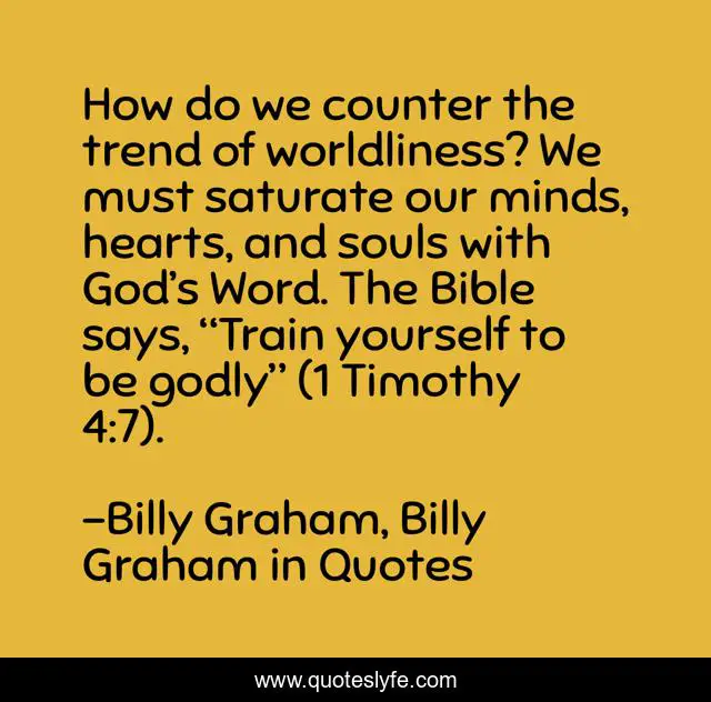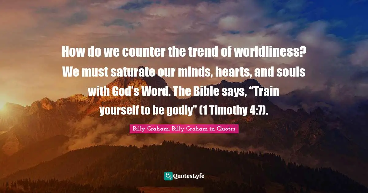 This page presents the quote "How do we counter the trend of worldliness? We must saturate our minds, hearts, and souls with God’s Word. The Bible says, “Train yourself to be godly” (1 Timothy 4:7).". Author of this quote is Billy Graham, Billy Graham in Quotes. This quote is about the-world, billy-graham,.