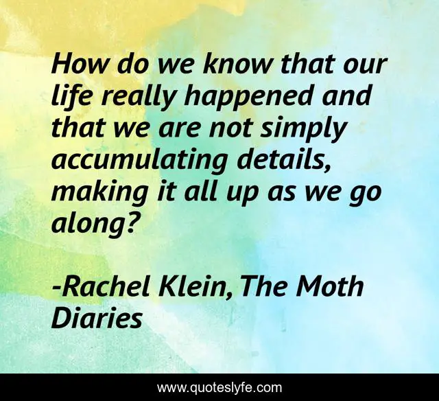 This page presents the quote "How do we know that our life really happened and that we are not simply accumulating details, making it all up as we go along?". Author of this quote is Rachel Klein, The Moth Diaries. This quote is about diary, life, supernatural,.