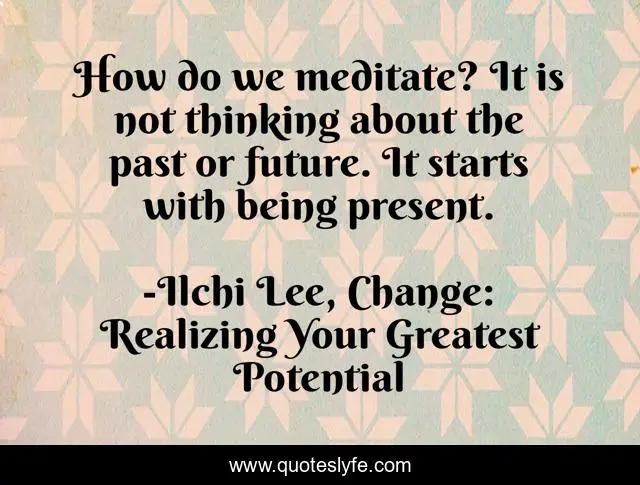 This page presents the quote "How do we meditate? It is not thinking about the past or future. It starts with being present.". Author of this quote is Ilchi Lee, Change: Realizing Your Greatest Potential. This quote is about enthusiasm, inspirational, self-development,.