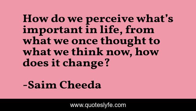 This page presents the quote "How do we perceive what’s important in life, from what we once thought to what we think now, how does it change?". Author of this quote is Saim Cheeda. This quote is about life, perception, importance, priority, maturity, growth, change,.