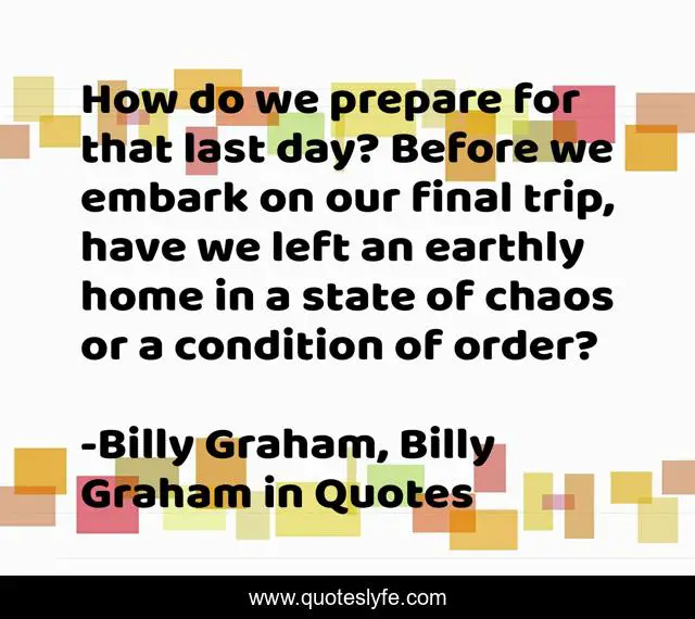 This page presents the quote "How do we prepare for that last day? Before we embark on our final trip, have we left an earthly home in a state of chaos or a condition of order?". Author of this quote is Billy Graham, Billy Graham in Quotes. This quote is about eternity, billy-graham,.