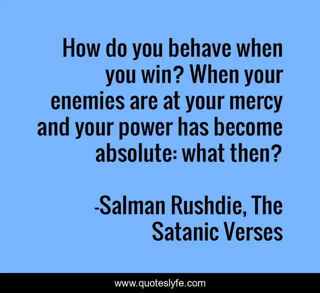 This page presents the quote "How do you behave when you win? When your enemies are at your mercy and your power has become absolute: what then?". Author of this quote is Salman Rushdie, The Satanic Verses. This quote is about absolute-power, behavior,.