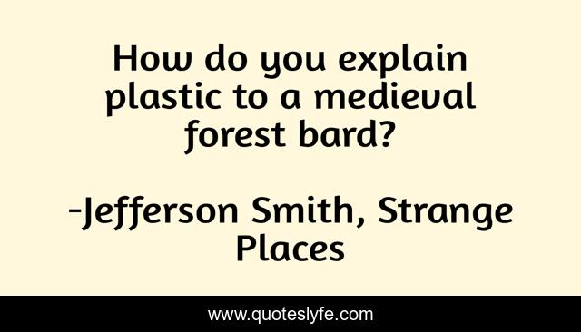 This page presents the quote "How do you explain plastic to a medieval forest bard?". Author of this quote is Jefferson Smith, Strange Places. This quote is about humor, humour, technology, anachronism, plastic, fantasy, young-adult,.