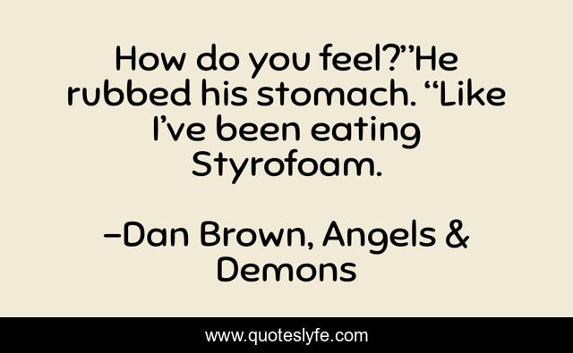 This page presents the quote "How do you feel?”He rubbed his stomach. “Like I’ve been eating Styrofoam.". Author of this quote is Dan Brown, Angels & Demons. This quote is about eating, feel, sick, stomach, feeling, styrofoam,.