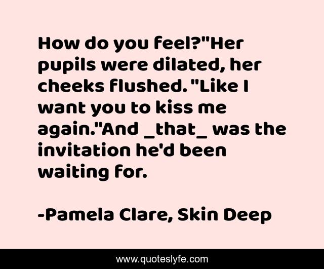 This page presents the quote "How do you feel?"Her pupils were dilated, her cheeks flushed. "Like I want you to kiss me again."And _that_ was the invitation he'd been waiting for.". Author of this quote is Pamela Clare, Skin Deep. This quote is about kiss, romantic-suspense,.