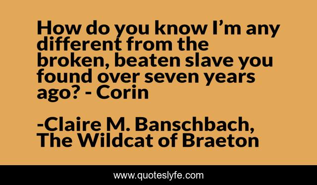 This page presents the quote "How do you know I’m any different from the broken, beaten slave you found over seven years ago? - Corin". Author of this quote is Claire M. Banschbach, The Wildcat of Braeton. This quote is about teen, fiction, fantasy, adventure, action, young-adult,.