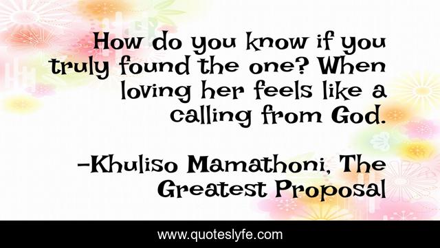 This page presents the quote "How do you know if you truly found the one? When loving her feels like a calling from God.". Author of this quote is Khuliso Mamathoni, The Greatest Proposal. This quote is about life, marriage, love-and-sayings, relationship, wisdom,.