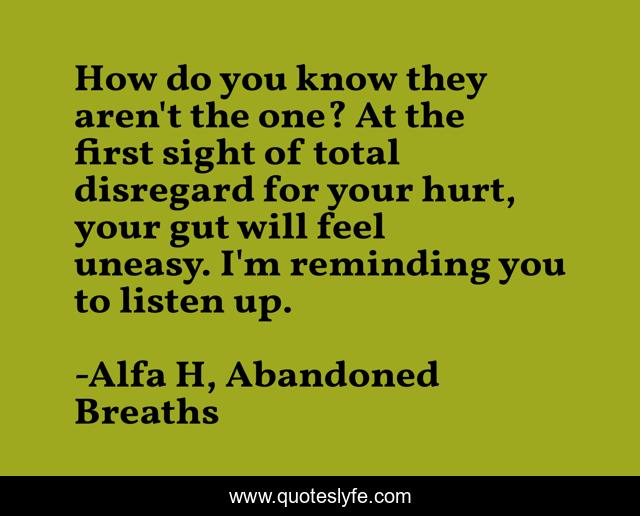 This page presents the quote "How do you know they aren't the one? At the first sight of total disregard for your hurt, your gut will feel uneasy. I'm reminding you to listen up.". Author of this quote is Alfa H, Abandoned Breaths. This quote is about relationships, red-flags, love, poetry, affection,.