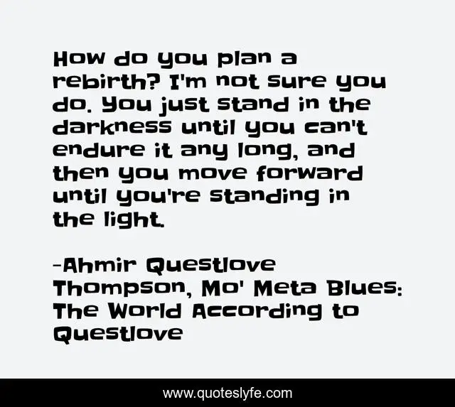 This page presents the quote "How do you plan a rebirth? I'm not sure you do. You just stand in the darkness until you can't endure it any long, and then you move forward until you're standing in the light.". Author of this quote is Ahmir Questlove Thompson, Mo' Meta Blues: The World According to Questlove. This quote is about forward, light, darkness, rebirth,.