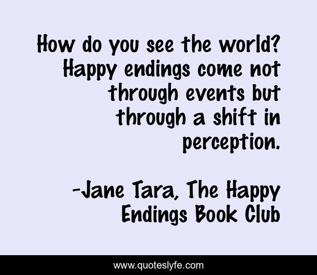 This page presents the quote "How do you see the world? Happy endings come not through events but through a shift in perception.". Author of this quote is Jane Tara, The Happy Endings Book Club. This quote is about perception, happy-endings, happiness,.