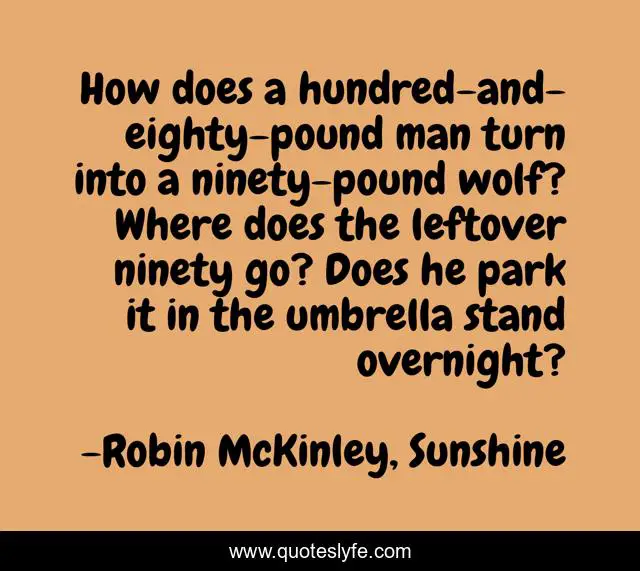 This page presents the quote "How does a hundred-and-eighty-pound man turn into a ninety-pound wolf? Where does the leftover ninety go? Does he park it in the umbrella stand overnight?". Author of this quote is Robin McKinley, Sunshine. This quote is about werewolves, practicality, transformation,.