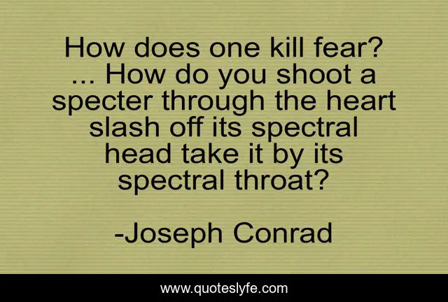 This page presents the quote "How does one kill fear? ... How do you shoot a specter through the heart slash off its spectral head take it by its spectral throat?". Author of this quote is Joseph Conrad. This quote is about ways, fear, overcome,.