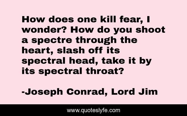 This page presents the quote "How does one kill fear, I wonder? How do you shoot a spectre through the heart, slash off its spectral head, take it by its spectral throat?". Author of this quote is Joseph Conrad, Lord Jim. This quote is about mystery, anxiety, torture, fright, self-loathing, mind, fight, courage, hope,.