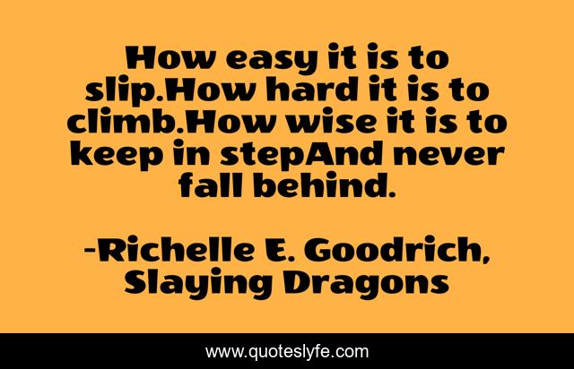 This page presents the quote "How easy it is to slip.How hard it is to climb.How wise it is to keep in stepAnd never fall behind.". Author of this quote is Richelle E. Goodrich, Slaying Dragons. This quote is about don-t-procrastinate, perservere, keep-up, work-hard, richelle-e-goodrich, work-ethic, procrastinate, richelle, procrastination,.