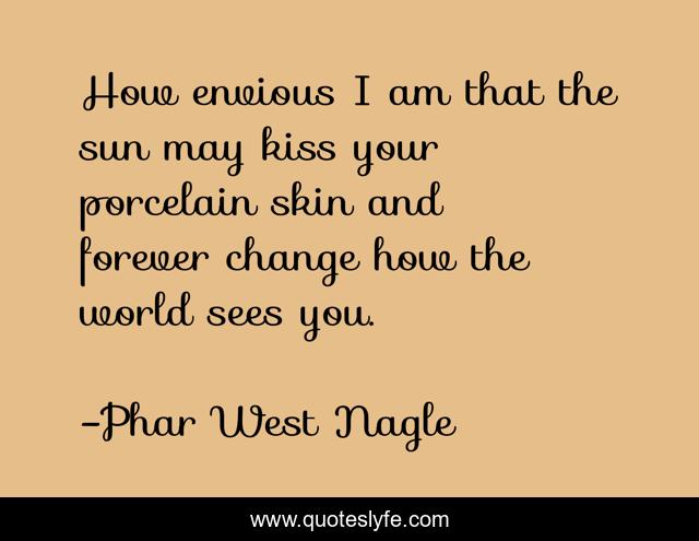 This page presents the quote "How envious I am that the sun may kiss your porcelain skin and forever change how the world sees you.". Author of this quote is Phar West Nagle. This quote is about lovers, love, love-poems, affection, poetry,.