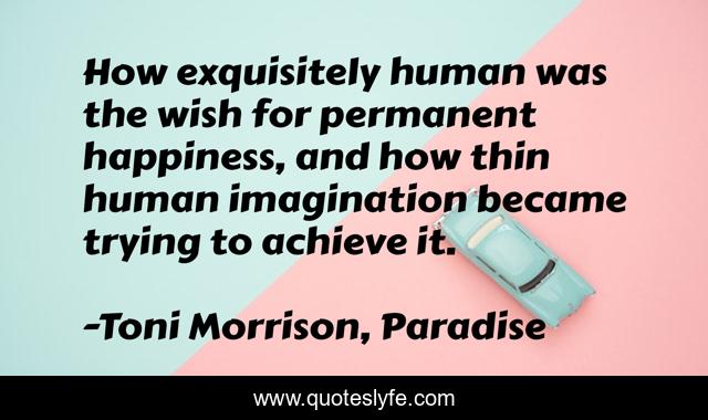This page presents the quote "How exquisitely human was the wish for permanent happiness, and how thin human imagination became trying to achieve it.". Author of this quote is Toni Morrison, Paradise. This quote is about human-condition, happiness,.
