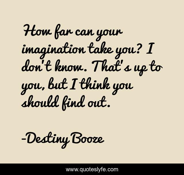 This page presents the quote "How far can your imagination take you? I don't know. That's up to you, but I think you should find out.". Author of this quote is Destiny Booze. This quote is about confidence, positive, motivational, imagination, optimistic, inspirational, enthusiasm,.