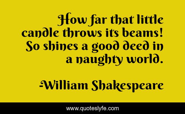 This page presents the quote "How far that little candle throws its beams! So shines a good deed in a naughty world.". Author of this quote is William Shakespeare. This quote is about world, little, candle,.