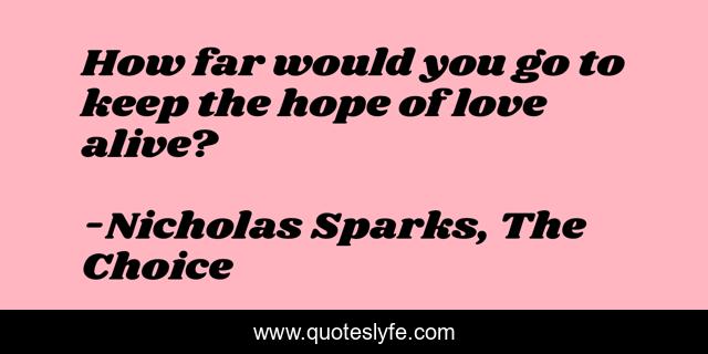 This page presents the quote "How far would you go to keep the hope of love alive?". Author of this quote is Nicholas Sparks, The Choice. This quote is about the-choice, love, sparks, nicholas-sparks, hope, nicholas, affection,.