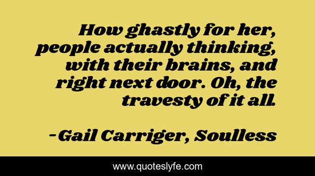 This page presents the quote "How ghastly for her, people actually thinking, with their brains, and right next door. Oh, the travesty of it all.". Author of this quote is Gail Carriger, Soulless. This quote is about thinking, brain, humor, alexia-tarabotti,.