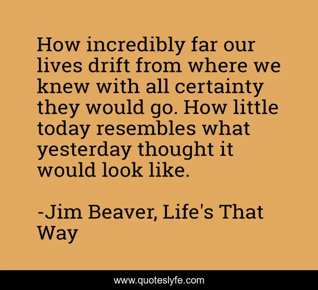 "Jim Beaver, Life's That Way Quotes." Quoteslyfe.com, 2025. Mon. 08 Dec. 2025. <https://www.quoteslyfe.com/quote/How-incredibly-far-our-lives-drift-from-153581>.