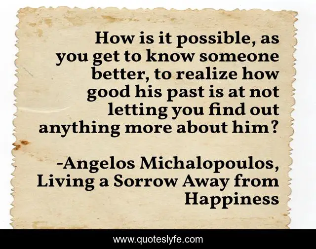 This page presents the quote "How is it possible, as you get to know someone better, to realize how good his past is at not letting you find out anything more about him?". Author of this quote is Angelos Michalopoulos, Living a Sorrow Away from Happiness. This quote is about enthusiasm, romance-book, self-improvement, inspirational,.