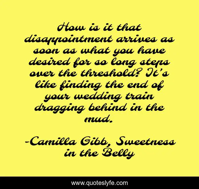 This page presents the quote "How is it that disappointment arrives as soon as what you have desired for so long steps over the threshold? It’s like finding the end of your wedding train dragging behind in the mud.". Author of this quote is Camilla Gibb, Sweetness in the Belly. This quote is about desire, waiting, disappointment,.