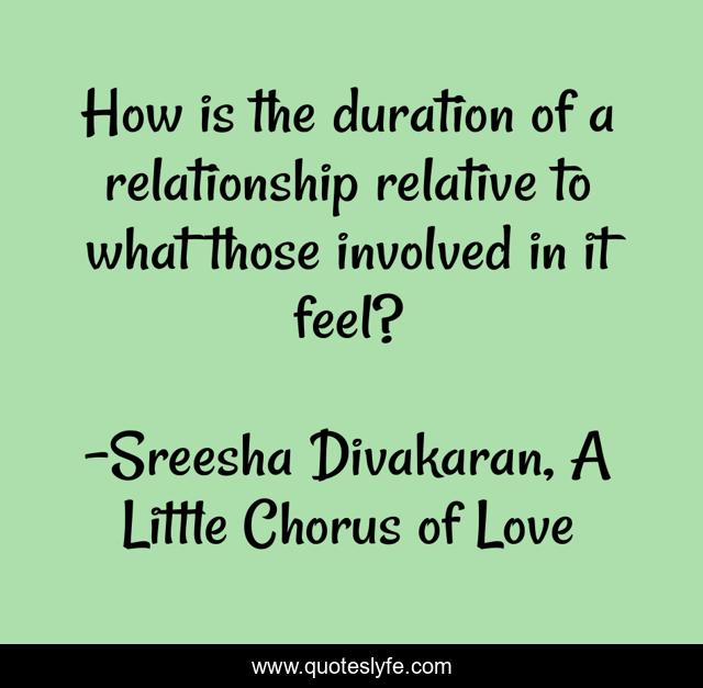 This page presents the quote "How is the duration of a relationship relative to what those involved in it feel?". Author of this quote is Sreesha Divakaran, A Little Chorus of Love. This quote is about love, relationship, affection, time,.