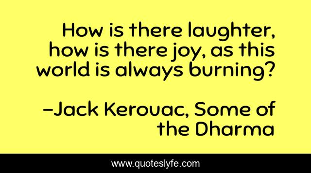 This page presents the quote "How is there laughter, how is there joy, as this world is always burning?". Author of this quote is Jack Kerouac, Some of the Dharma. This quote is about joy, life, sadness, happiness,.