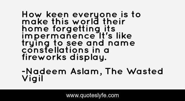 This page presents the quote "How keen everyone is to make this world their home forgetting its impermanence It's like trying to see and name constellations in a fireworks display.". Author of this quote is Nadeem Aslam, The Wasted Vigil. This quote is about life, literature, philosophy,.