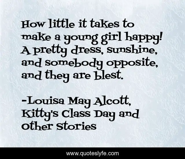This page presents the quote "How little it takes to make a young girl happy! A pretty dress, sunshine, and somebody opposite, and they are blest.". Author of this quote is Louisa May Alcott, Kitty's Class Day and Other Stories. This quote is about life, love, naivete, girls, happiness, pretty-little-things, affection,.
