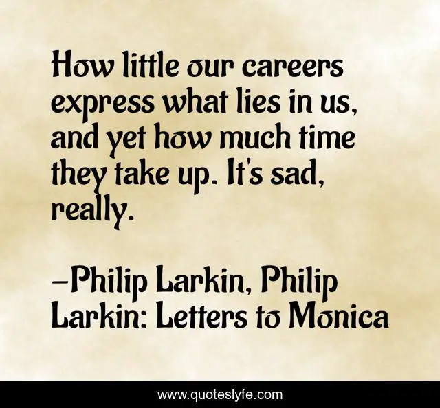This page presents the quote "How little our careers express what lies in us, and yet how much time they take up. It's sad, really.". Author of this quote is Philip Larkin, Philip Larkin: Letters to Monica. This quote is about sadness, work,.