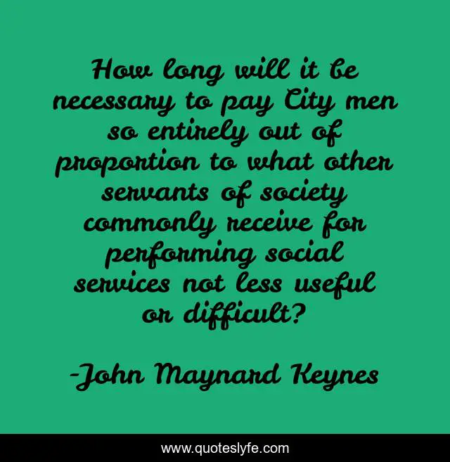 This page presents the quote "How long will it be necessary to pay City men so entirely out of proportion to what other servants of society commonly receive for performing social services not less useful or difficult?". Author of this quote is John Maynard Keynes. This quote is about society, wages, economy, wealth, bankers,.