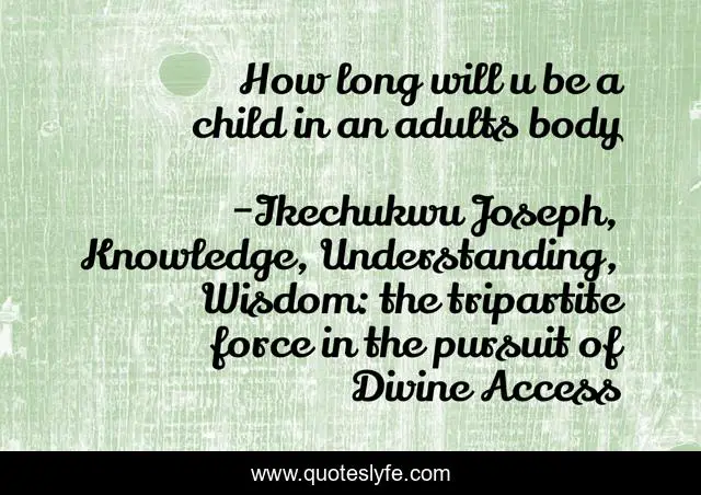 This page presents the quote "How long will u be a child in an adults body". Author of this quote is Ikechukwu Joseph, Knowledge, Understanding, Wisdom: the tripartite force in the pursuit of Divine Access. This quote is about christian-living, wisdom,.