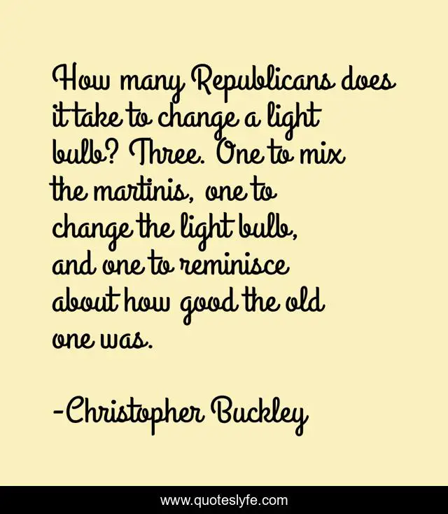 This page presents the quote "How many Republicans does it take to change a light bulb? Three. One to mix the martinis, one to change the light bulb, and one to reminisce about how good the old one was.". Author of this quote is Christopher Buckley. This quote is about light, good, three,.