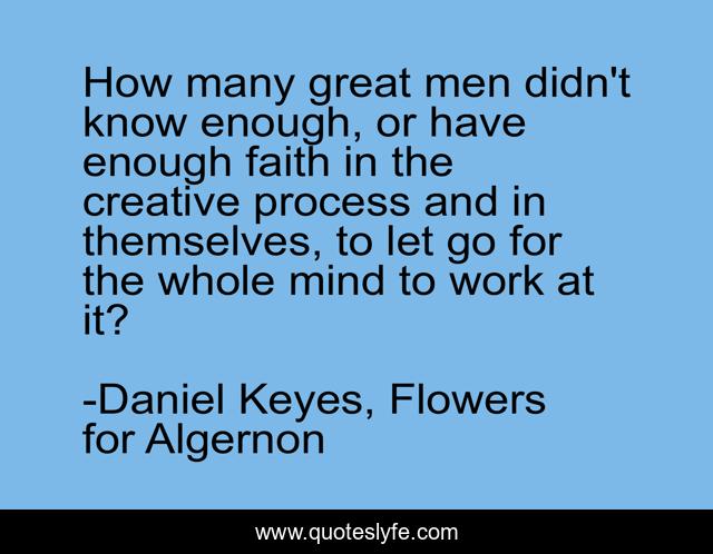 This page presents the quote "How many great men didn't know enough, or have enough faith in the creative process and in themselves, to let go for the whole mind to work at it?". Author of this quote is Daniel Keyes, Flowers for Algernon. This quote is about process, faith, work, mind, great-men,.