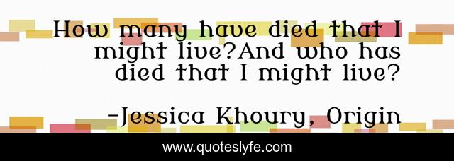 This page presents the quote "How many have died that I might live?And who has died that I might live?". Author of this quote is Jessica Khoury, Origin. This quote is about life, death, sacrifice, realization,.
