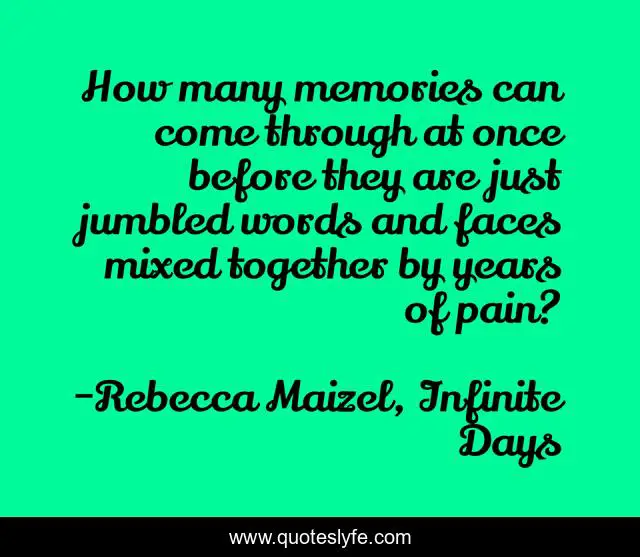 This page presents the quote "How many memories can come through at once before they are just jumbled words and faces mixed together by years of pain?". Author of this quote is Rebecca Maizel, Infinite Days. .