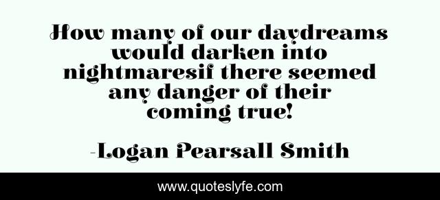 This page presents the quote "How many of our daydreams would darken into nightmaresif there seemed any danger of their coming true!". Author of this quote is Logan Pearsall Smith. This quote is about danger, dreaming,.