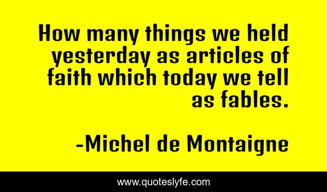 This page presents the quote "How many things we held yesterday as articles of faith which today we tell as fables.". Author of this quote is Michel de Montaigne. This quote is about things, yesterday, today,.