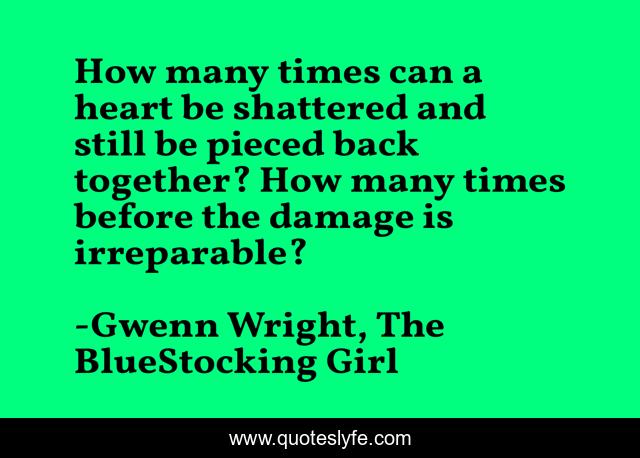 This page presents the quote "How many times can a heart be shattered and still be pieced back together? How many times before the damage is irreparable?". Author of this quote is Gwenn Wright, The BlueStocking Girl. This quote is about loss, death, love, grief, young-adult-fiction, historical-fiction, bluestocking-girl, von-strassenberg, affection,.