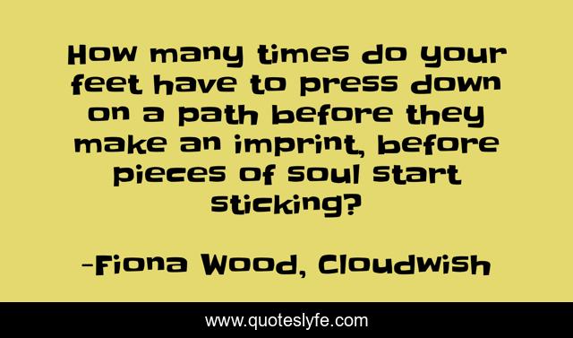 This page presents the quote "How many times do your feet have to press down on a path before they make an imprint, before pieces of soul start sticking?". Author of this quote is Fiona Wood, Cloudwish. This quote is about home, philosophy, soul-searching,.
