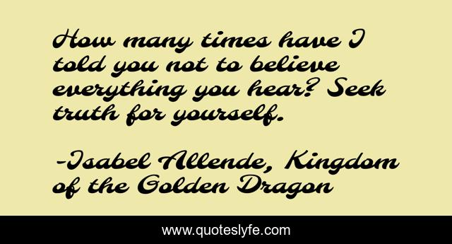 This page presents the quote "How many times have I told you not to believe everything you hear? Seek truth for yourself.". Author of this quote is Isabel Allende, Kingdom of the Golden Dragon. .