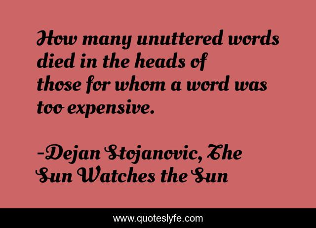 This page presents the quote "How many unuttered words died in the heads of those for whom a word was too expensive.". Author of this quote is Dejan Stojanovic, The Sun Watches the Sun. This quote is about poets, literature, heads, the-sun-watches-the-sun, dejan-stojanovic, philosophy, poetry, quotes, words,.