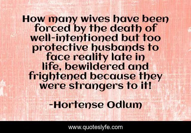 This page presents the quote "How many wives have been forced by the death of well-intentioned but too protective husbands to face reality late in life, bewildered and frightened because they were strangers to it!". Author of this quote is Hortense Odlum. This quote is about strangers, life, reality,.
