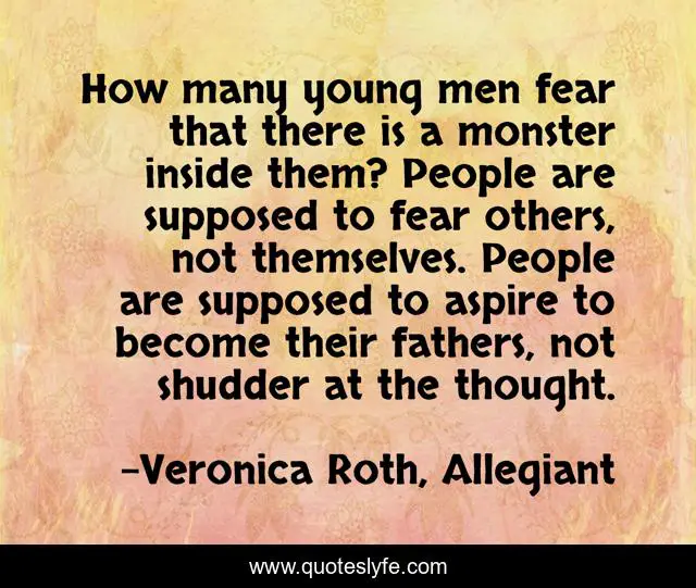 This page presents the quote "How many young men fear that there is a monster inside them? People are supposed to fear others, not themselves. People are supposed to aspire to become their fathers, not shudder at the thought.". Author of this quote is Veronica Roth, Allegiant. This quote is about domestic-violence, thought-provoking, thoughts-of-you,.