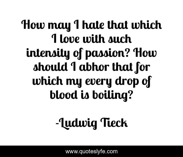 This page presents the quote "How may I hate that which I love with such intensity of passion? How should I abhor that for which my every drop of blood is boiling?". Author of this quote is Ludwig Tieck. This quote is about hate, love, blood, affection,.