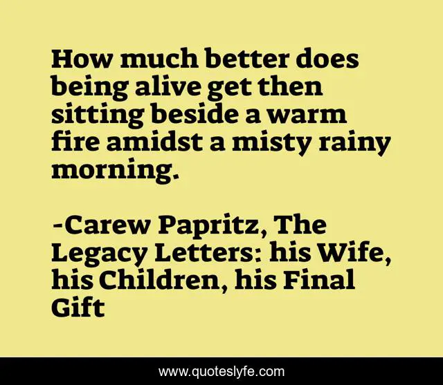 This page presents the quote "How much better does being alive get then sitting beside a warm fire amidst a misty rainy morning.". Author of this quote is Carew Papritz, The Legacy Letters: his Wife, his Children, his Final Gift. This quote is about book, carew-papritz, rain, the-legacy-letters,.