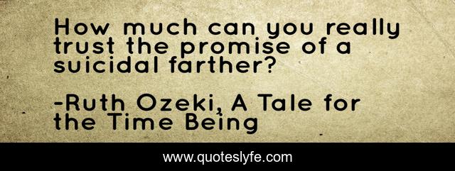 This page presents the quote "How much can you really trust the promise of a suicidal farther?". Author of this quote is Ruth Ozeki, A Tale for the Time Being. This quote is about suicide, promise, childhood, sad,.